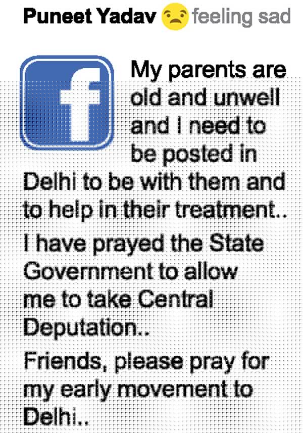 দুঃখের কারণ? নিজের ওয়ালে সেটাও সংক্ষেপে লিখলেন পুনীত— ‘আমার বাবা-মা বৃদ্ধ ও অসুস্থ। সঙ্গে থেকে তাঁদের চিকিৎসা করানোর জন্য আমার দিল্লিতে পোস্টিং দরকার। সে জন্য কেন্দ্রীয় সরকারের কাজে যোগ দিতে চেয়ে রাজ্যের কাছে আবেদন করেছি।’
