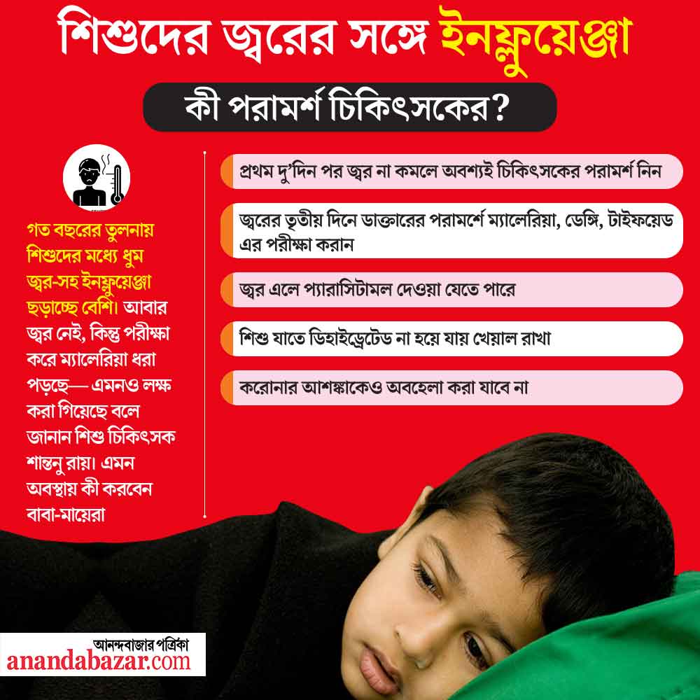 কোভিডের মতো উপসর্গ, কিন্তু পরীক্ষা করলে রিপোর্ট আসছে নেগেটিভ। শহর এবং শহরতলিতে জ্বর নিয়ে চিকিৎসকের কাছে যাচ্ছেন অনেকেই। বাদ যাচ্ছে না শিশুরাও। শহরের বেশ কয়েকজন শিশু চিকিৎসক জানাচ্ছেন, গত বছরের তুলনায় শিশুদের মধ্যে ধুম জ্বর-সহ ইনফ্লুয়েঞ্জা ছড়াচ্ছে বেশি। আবার জ্বর নেই, কিন্তু পরীক্ষা করে ম্যালেরিয়া ধরা পড়ছে— এমন ঘটনাও লক্ষ করা গিয়েছে বলে জানান শিশু চিকিৎসক শান্তনু রায়।