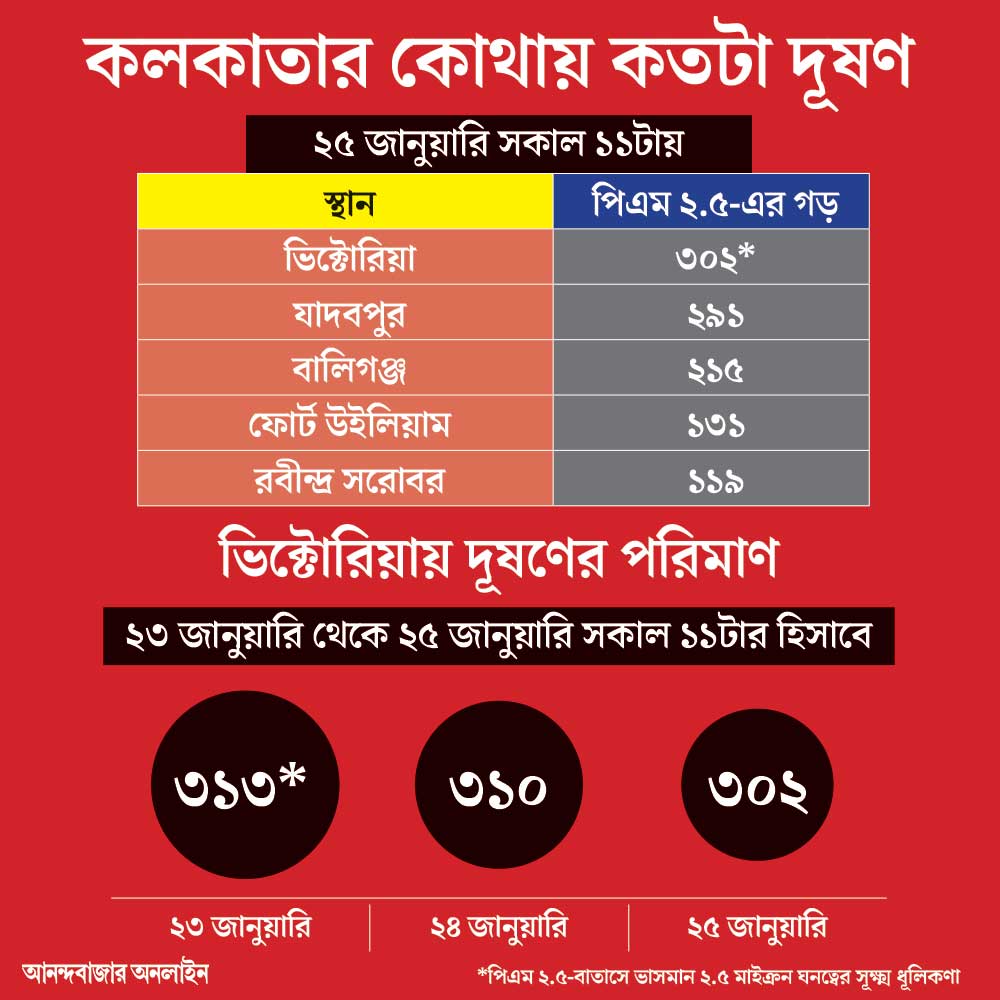 বুধবার কলকাতার সবচেয়ে দূষিত এলাকা শহরের ‘ফুসফুস’ ময়দান চত্বর। মঙ্গলবারও তাই ছিল। গত সোমবারও। এমনটাই বলছে রাজ্যের দূষণ নিয়ন্ত্রণ বোর্ডের পরিসংখ্যান। রাজ্যের দূষণ নিয়ন্ত্রণ বোর্ডের রিপোর্ট বলছে, বুধবার সকাল ১১টার রিপোর্ট অনুযায়ী, ভিক্টোরিয়া চত্বরে বাতাসে ভাসমান সূক্ষ্ম ধূলিকণার গড় (পিএম ২.৫) ৩০২ (অত্যন্ত খারাপ)। যা কলকাতার বাকি এলাকাগুলির থেকে বেশি। বিগত দু’-তিন দিন বেলা ১২টা নাগাদ বাতাসে ভাসমান ধূলিকণার পরিমাণ সব থেকে বেশি ছিল ভিক্টোরিয়া সংলগ্ন এলাকাতেই। অর্থাৎ, গত কয়েকদিনের হিসাব অনুযায়ী, ওই এলাকায় গিয়ে ‘বিষবায়ু’ গ্রহণ করছেন কলকাতার সাধারণ মানুষ। এই পরিস্থিতিতে সকালের দিকে ময়দানে প্রার্তভ্রমণে না যাওয়ার পরামর্শ দিয়েছেন পশ্চিমবঙ্গ দূষণ নিয়ন্ত্রণ পর্ষদের চেয়ারম্যান কল্যাণ রুদ্র।