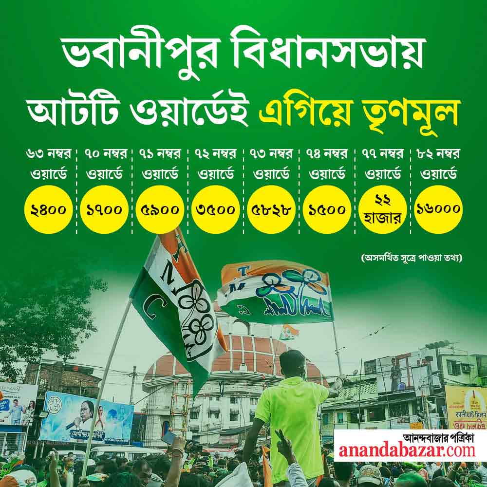 ওই বছরই সেপ্টেম্বর মাসে উপনির্বাচনে খুব কম ভোট পড়লেও সব ওয়ার্ডে ব্যবধান পেয়েছিলেন মমতা। কিন্তু ২০১৪ সালের লোকসভা নির্বাচনে ভবানীপুরে প্রথম ধাক্কা খায় তৃণমূল। সেই নির্বাচনে ৬৩, ৭০, ৭১, ৭২ ও ৭৪ ওয়ার্ডে ভাল ব্যবধান পেয়ে ভবানীপুর বিধানসভা থেকে ১৭৬ ভোটে এগিয়েছিলেন বিজেপি-র প্রার্থী তথাগত রায়। ২০১৫ সালের পুরসভা ভোটে ৭০ নম্বর ওয়ার্ড থেকে জয়ী হন বিজেপি প্রার্থী অসীম বসু। কিন্তু মাত্র কয়েক মাস পরেই তিনি যোগ দেন তৃণমূলে। কাউন্সিলর বিজেপি ছেড়ে তৃণমূলে যোগ দিলেও, ওই ওয়ার্ডের ফলাফল তৃণমূলের পক্ষে যায়নি। ২০১৬ সালের বিধানসভা নির্বাচনে ভবানীপুর বিধানসভায় বিজেপি প্রার্থী চন্দ্র বসু তৃতীয় হলেও, ৭০ নম্বর ওয়ার্ড থেকে ১৮০০ ভোটে এগিয়েছিলেন তিনি। আবার ২০১৯ সালের লোকসভা ভোটে ভবানীপুর বিধানসভায় ৭৭ ও ৮২ নম্বর ওয়ার্ড বাদ দিয়ে সবক’টি ওয়ার্ডেই পিছিয়ে ছিলেন তৃণমূল প্রার্থী মালা রায়। এমনকি মুখ্যমন্ত্রীর নিজের ওয়ার্ডেও বিজেপি এগিয়ে গিয়েছিল ৪৯৬ ভোটে। কিন্তু এপ্রিল মাসের বিধানসভা নির্বাচনে ছ’টি ওয়ার্ডে এগিয়ে থাকলেও ৭০ ও ৭৪ নম্বর ওয়ার্ডে যথাক্রমে ২০৯২ ও ৫৩৭ ভোটে পিছিয়ে পড়েছিলেন তৃণমূল প্রার্থী শোভনদেব চট্টোপাধ্যায়। তাই এ বারের উপনির্বাচনেও ৭০ ও ৭৪ নম্বর ওয়ার্ড নিয়ে আশায় বুক বাঁধছিলেন বিজেপি প্রার্থী প্রিয়ঙ্কা টিবরেওয়াল।