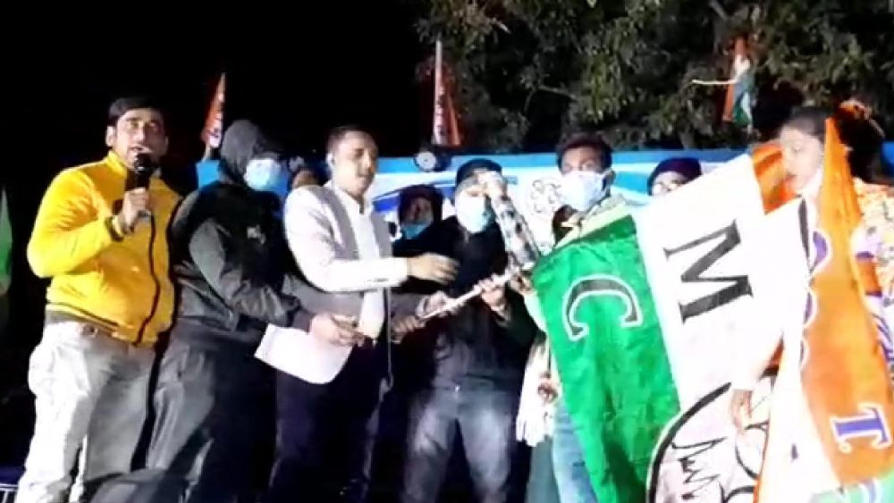 তৃণমূলের জেলা সভাপতি সুজয় হাজরা বিজেপি ছেড়ে আসা নেতা-কর্মীদের হাতে তৃণমূলের দলীয় পতাকা তুলে দেন।