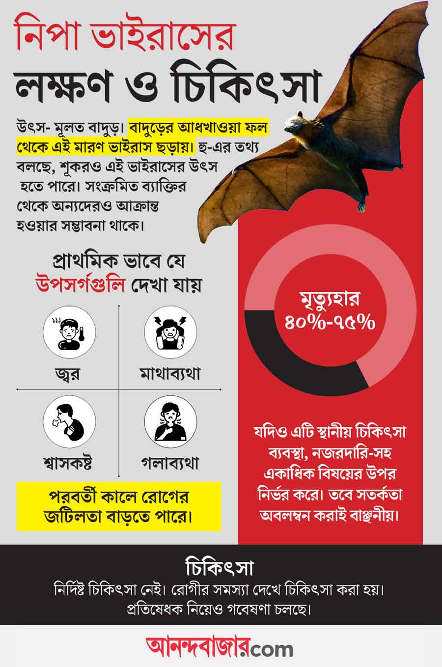 চিকিৎসকেরা বলছেন, এই ভাইরাসের উৎস মূলত বাদুড়। বাদুড়ের আধখাওয়া ফল থেকে ছড়ায় এই ভাইরাস। কখনও কখনও আক্রান্তের ব্যবহৃত জিনিসপত্র থেকেও সংক্রমণ ছড়াতে পারে। জনস্বাস্থ্য বিশেষজ্ঞ অনির্বাণ দলুইয়ের কথায়, ‘‘প্রাথমিক পর্যায়ে এই রোগের কোনও আলাদা উপসর্গ থাকে না। জ্বর, শ্বাসকষ্ট, মাথা ধরা, পেট খারাপ, দুর্বলতা, খিদে কমে যাওয়া— এ রকম সাধারণ উপসর্গ দেখা যায়। এ রকম হলে দ্রুত ডাক্তার দেখাতে হবে। এ ছাড়াও সাবান দিয়ে হাত ধোওয়া, সবজি ও ফল ভাল করে ধুয়ে খাওয়া, আধখাওয়া ফল, খেজুর বা ফলের রস না খাওয়া— এ সব সতর্কতা মেনে চলতে হবে।’’ অনির্বাণ জানাচ্ছেন, দ্রুত সংক্রমণ না ছড়ালেও নিপা ভাইরাসে মৃত্যুহার বেশি (৪০ থেকে ৭৫ শতাংশ)। তাই সব রকম সতর্কতা অবলম্বন করাই বাঞ্ছনীয়।