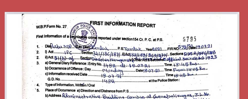 পুলিশ সূত্রে খবর, সোমবার তমলুকে ৫০ জনের বেশি অনুগামী নিয়ে গিয়ে সভা করেন শুভেন্দু। ফলে কোভিড বিধি ভেঙেছেন তিনি। তাই বিপর্যয় মোকাবিলা আইনে মামলা দায়ের করা হয়েছে তাঁর বিরুদ্ধে। এ ছাড়া সরকারি কাজে বাধা দিয়েছেন তিনি। সেই ধারাতেও মামলা হয়েছে। পুলিশ সুপারকে হুমকি দেওয়া ও পুলিশের ফোন আড়ি পাতারও অভিযোগ উঠেছে শুভেন্দুর বিরুদ্ধে। পূর্ব মেদিনীপুরের পুলিশ সুপার অমরনাথ কে জানিয়েছেন, ‘‘ওনার বিরুদ্ধে তমলুক থানায় এফআইআর দায়ের হয়েছে। করোনা বিধি ভেঙে জমায়েত করায় বিপর্যয় মোকাবিলা আইনের নির্দিষ্ট ধারায় মামলা হয়েছে।’’