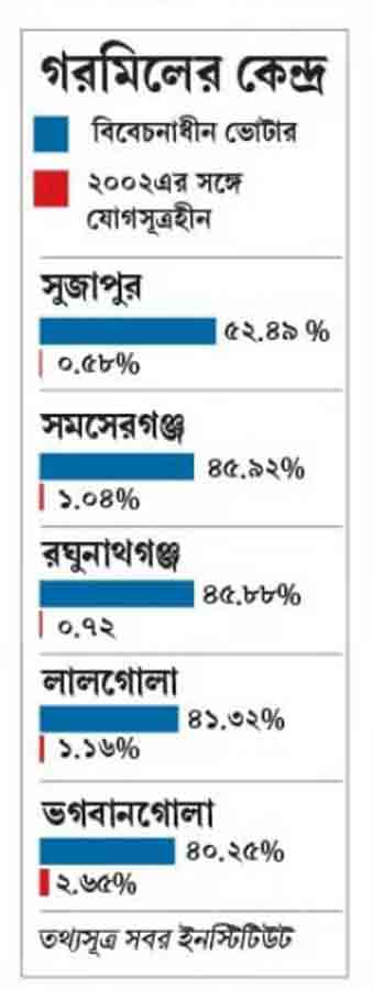 গিয়েছে। সবর ইনস্টিটিউটের অশীন চক্রবর্তী, সাবির আহমেদরা তথ্য বিশ্লেষণ করে দেখাচ্ছেন, সুজাপুরের ক্ষেত্রে যোগসূত্রহীন ভোটারের শতাংশ ০.৫৮ থাকলে এখন বিবেচনাধীন ভোটারের হারে তা ৫২.৪৯ শতাংশ। একই ভাবে ৪০-৪৫ শতাংশ বিবেচনাধীন ভোটার রয়েছে সমসেরগঞ্জ, রঘুনাথগঞ্জ, লালগোলা এবং ভগবানগোলায়।