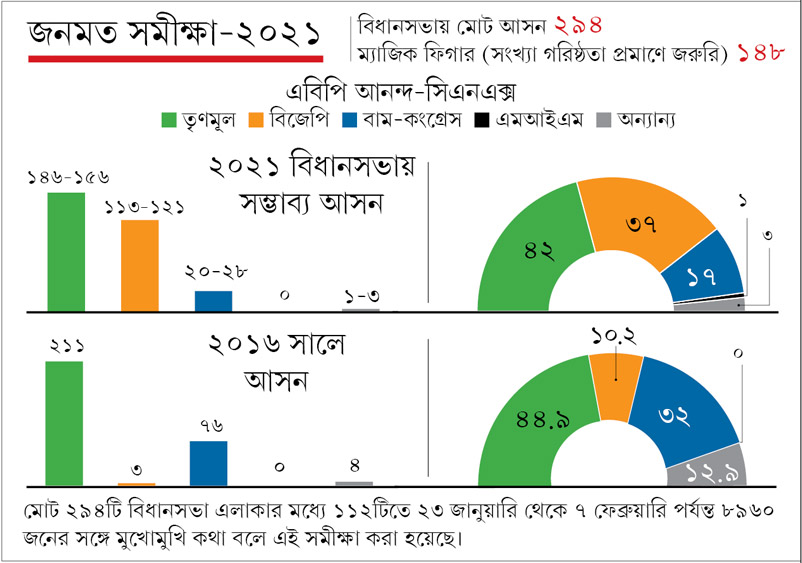 তারই পরিপ্রেক্ষিতে সমীক্ষার ফলাফল অনুযায়ী, তৃণমূল জিততে পারে ১৪৬ থেকে ১৫৬ আসন। একক শক্তিতে সরকার গঠনের জন্য যে কোনও দলের দরকার কমপক্ষে ১৪৮ আসন। সে দিক থেকে সমীক্ষার ফল অনুযায়ী, তৃণমূলের একক সংখ্যাগরিষ্ঠতা পাওয়া নিয়ে কিছুটা সংশয় থেকেই যায়। আবার রাজ্যে ক্ষমতা দখলের লক্ষ্যে ঝাঁপিয়ে পড়া বিজেপি, এই সমীক্ষা অনুযায়ী, ১১৩ থেকে ১২১ আসন পেতে পারে। যা ১৪৮-এর থেকে অনেকটাই কম। এই সমীক্ষায় বাম-কংগ্রেস জোটের সম্ভাব্য আসন ২০ থেকে ২৮। এবং অন্যান্য (গোর্খা জনমুক্তি মোর্চা ইত্যাদি) পেতে পারে ১ থেকে ৩টি।