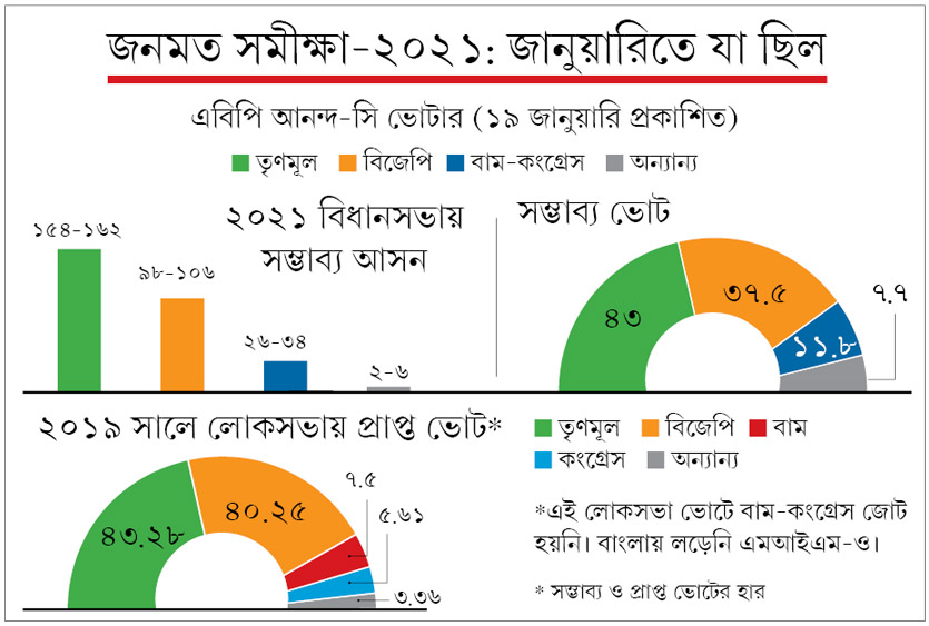 গত এক মাসের মধ্যে তৃণমূলে আরও কিছু ভাঙন দেখা গিয়েছে। মন্ত্রী, বিধায়ক-সহ অনেকেই শিবির বদল করে গেরুয়া পতাকা ধরেছেন। রাজ্যে আনাগোনা বেড়েছে প্রধানমন্ত্রী নরেন্দ্র মোদী, কেন্দ্রীয় স্বরাষ্ট্রমন্ত্রী অমিত শাহ, বিজেপির সর্বভারতীয় সভাপতি জে পি নড্ডার। পাশাপাশি, মুখ্যমন্ত্রী মমতা বন্দ্যোপাধ্যায়, সাংসদ অভিষেক বন্দ্যোপাধ্যায়-সহ তৃণমূলের শীর্ষ নেতারা জেলায় বড় বড় সভা-সমাবেশ করছেন। তা সত্ত্বেও বর্তমান সমীক্ষা অনুযায়ী, এই দু’দলের কারওরই সংখ্যাগরিষ্ঠতায় পৌঁছতে না পারার যে সম্ভাবনা ধরা পড়ছে, তা অর্থবহ।