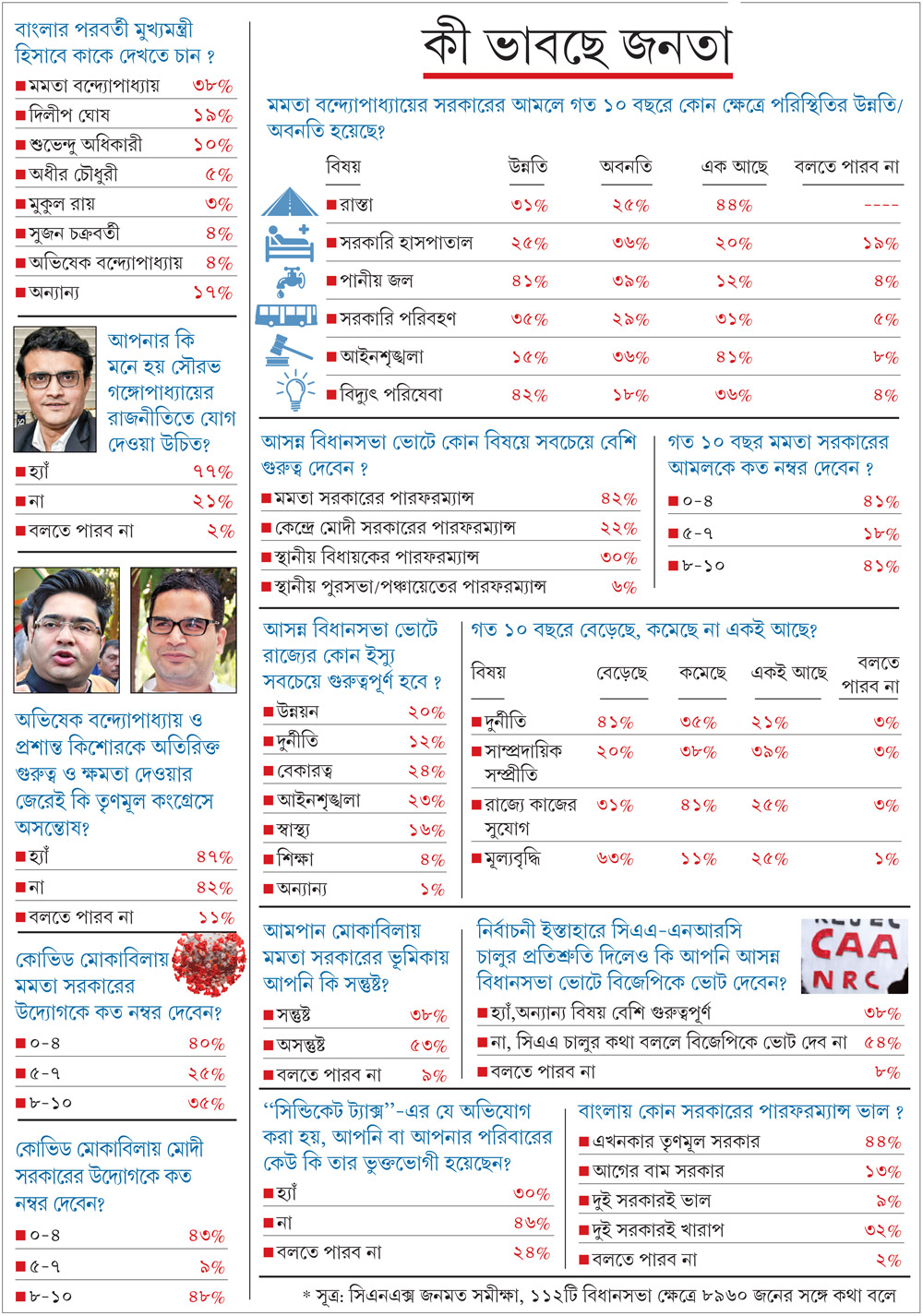 রাজ্যে বিধানসভার মোট আসন ২৯৪। তবে বর্তমান সমীক্ষায় রাজ্যের সব ক’টি অর্থাৎ ৪২টি লোকসভা কেন্দ্রকে ভিত্তি করে তার অন্তর্গত ১১২টি বিধানসভা কেন্দ্র বেছে নেওয়া হয়েছে। মহিলা ও পুরুষ মিলিয়ে কথা বলা হয়েছে ৮ হাজার ৯৬০ জনের সঙ্গে। ২৩ জানুযারি থেকে ৭ ফেব্রুয়ারির মধ্যে এই সমীক্ষা চালানো হয়েছে। এই ধরনের সমীক্ষা সব সময়ই স্বীকৃত পদ্ধতি মেনে করা হয়। তবে তাতে কিছু অনিশ্চয়তাও থাকে। তাই সমীক্ষার ফলাফল যা-ই হোক, সেটা চূড়ান্ত বলে মেনে নেওয়ার কারণ নেই। এটি একটি নির্দিষ্ট সময়কালে নেওয়া জনমতের এক প্রতিফলন মাত্র।