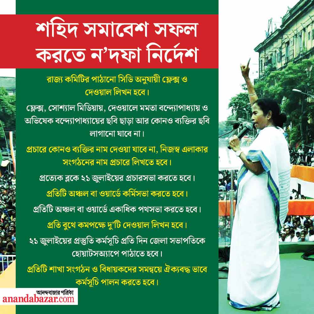 এই ন’দফা নির্দেশিকায় বলা হয়েছে, কোনওভাবেই নেত্রী মমতা বন্দ্যোপাধ্যায় ও সর্বভারতীয় সাধারণ সম্পাদক অভিষেক বন্দ্যোপাধ্যায় ছাড়া আর কারও ছবি ব্যবহার করা যাবে না। সঙ্গে শীর্ষ নেতৃত্বের নির্দেশ মেনে, রাজ্য কমিটির প্রেরিত সিডি অনুযায়ী ফ্লেক্স ও দেওয়াল লিখন করতে হবে। প্রচারে কোনও ব্যক্তির নাম দেওয়া যাবে না, নিজস্ব এলাকার সংগঠনের নাম প্রচারে লিখতে হবে। রাজ্যের প্রত্যেক ব্লকে ২১ জুলাইয়ের বর্ধিত প্রচারসভা করতে হবে। রাজ্যের প্রতিটি অঞ্চল/ ওয়ার্ডে কর্মিসভা করতে হবে। সঙ্গে প্রতিটি অঞ্চল/ ওয়ার্ডের বিভিন্ন জায়গায় পথসভা করতে হবে।