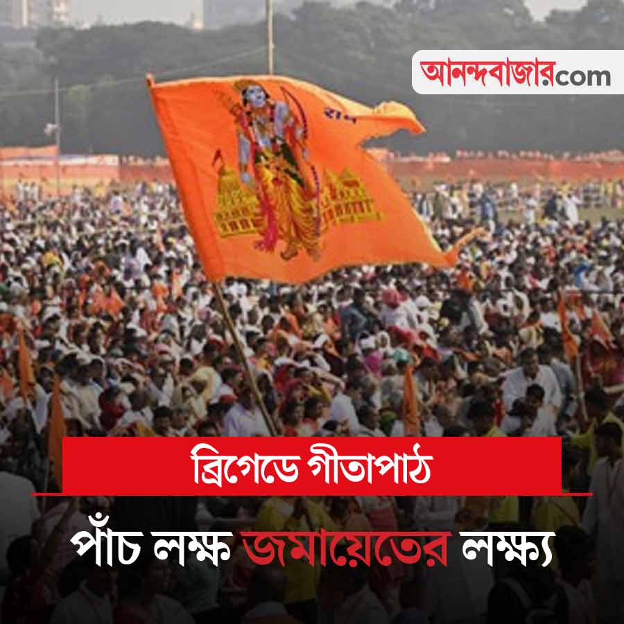 আজ কলকাতার ব্রিগেড প্যারেড গ্রাউন্ডে গীতাপাঠের আয়োজন করা হয়েছে। সেইমতো তৈরি হয়েছে ব্রিগেড। তৈরি করা হয়েছে তিনটি মঞ্চ। আয়োজনের দায়িত্বে ‘সনাতন সংস্কৃতি সংসদ’। বছর দুই আগে এই ব্রিগেডে আয়োজিত হয়েছিল লক্ষ কণ্ঠে গীতাপাঠ! এ বার পাঁচ লক্ষ জমায়েত হবে বলে দাবি করা হয়েছে আয়োজকদের তরফে। এই কর্মসূচিতে উপস্থিত থাকবেন দিলীপ ঘোষ, রাজ্য বিজেপির সভাপতি শমীক ভট্টাচার্য, কেন্দ্রীয় মন্ত্রী সুকান্ত মজুমদারেরা। এ ছাড়াও, দেশের বিভিন্ন প্রান্ত থেকে সাধুসন্তেরা আসবেন। আজ এই সংক্রান্ত খবরের দিকে নজর থাকবে।
