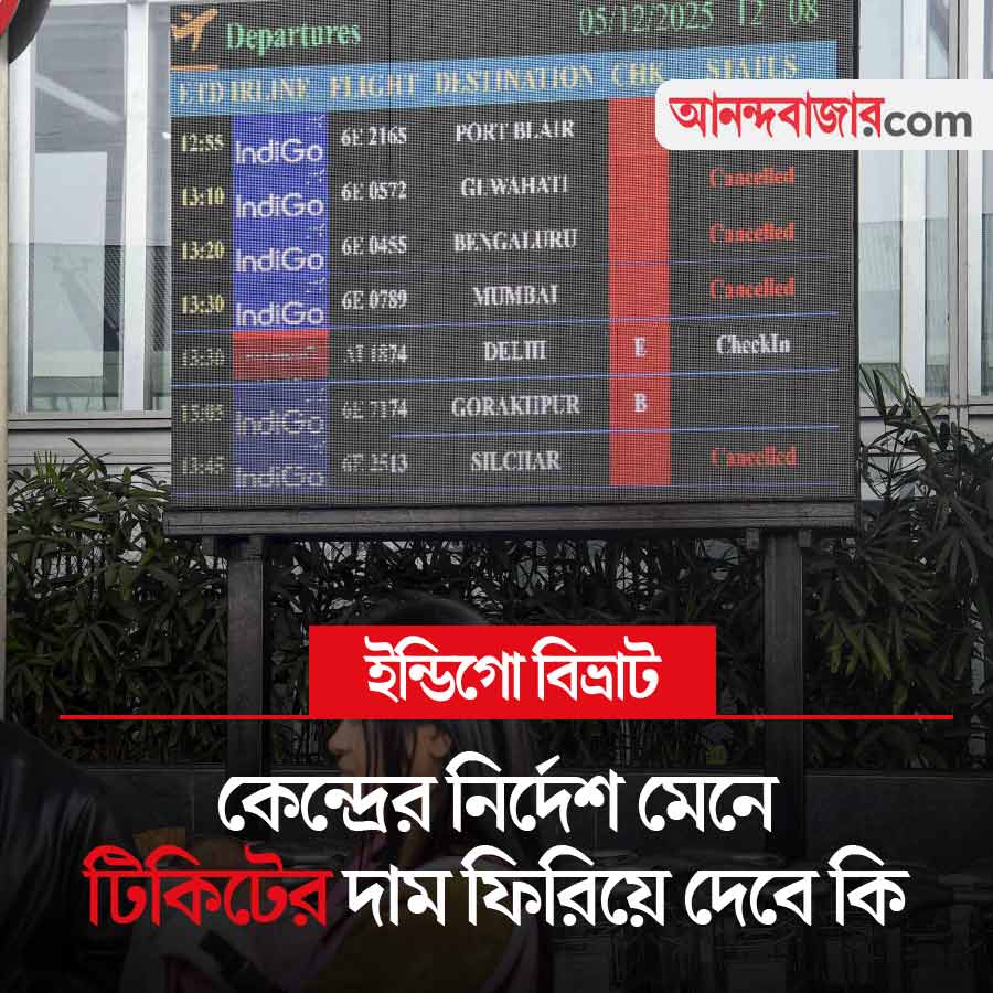 ইন্ডিগো সংস্থার একের পর এক বিমান বাতিল। শুক্রবারের পরে শনিবারও একই পরিস্থিতি দেশ জুড়ে। যাত্রীদের ভোগান্তি অব্যাহত। অবস্থা বুঝে ইচ্ছামতো ভাড়া আদায়ের অভিযোগ উঠেছে দেশের অন্য বিমান সংস্থাগুলির বিরুদ্ধে। এই পরিস্থিতিতে কড়া পদক্ষেপ করেছে কেন্দ্র। শনিবার ইন্ডিগো সংস্থাকে তারা নির্দেশ দিয়ে জানাল, আজ রাত ৮টার মধ্যেই বাতিল হওয়া বিমানের টিকিটের টাকা ফেরাতে হবে যাত্রীদের। অন্য সংস্থাগুলি যাতে ইচ্ছামতো ভাড়া নিতে না-পারে, সেই নিয়েও তৎপর কেন্দ্রীয় অসামরিক বিমান পরিবহণ মন্ত্রক। আজ কি পরিস্থিতির বদল হবে? কেন্দ্রের নির্দেশ মতো কি টাকা ফিরিয়ে দেবে সংস্থা?