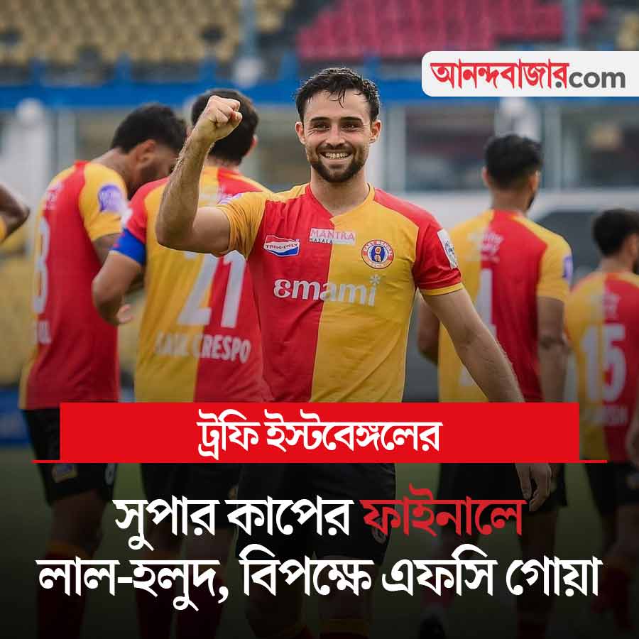 আজ সুপার কাপের ফাইনাল। কলকাতা লিগ বাদ দিলে মরসুমের প্রথম ট্রফি জয়ের হাতছানি ইস্টবেঙ্গলের সামনে। লাল-হলুদের সামনে গোয়া। খেলা গোয়ার মাঠে। ফলে কঠিন লড়াই ইস্টবেঙ্গলের সামনে। তার উপর এই ম্যাচে ডাগ আউটে থাকতে পারবেন না কোচ অস্কার ব্রুজ়ো। ইস্টবেঙ্গল কি পারবে? খেলা সন্ধ্যা ৭:৩০ থেকে। খেলা দেখা যাবে স্টার স্পোর্টস চ্যানেল ও জিটোহটস্টার অ্যাপে।