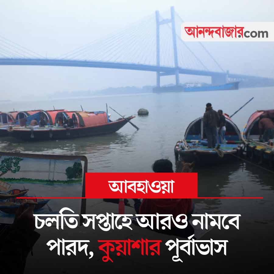 শুক্রবার যেখানে শহরের সর্বনিম্ন তাপমাত্রা ছিল ১৭ ডিগ্রি সেলসিয়াস, সেখানে শনিবার ঝপ করে তা ১৪ ডিগ্রিতে নেমে গিয়েছে। শনিবার সকালে কলকাতার সর্বনিম্ন তাপমাত্রা ছিল ১৪.৫ ডিগ্রি সেলসিয়াস, স্বাভাবিকের চেয়ে ২.১ ডিগ্রি কম। আলিপুর আবহাওয়া দফতর জানিয়েছে, আগামী দু’দিনে দক্ষিণবঙ্গে আরও অন্তত দুই ডিগ্রি কমতে পারে রাতের তাপমাত্রা। তবে উত্তরবঙ্গে আপাতত তাপমাত্রার কোনও হেরফের হবে না। সর্বত্র শুকনো আবহাওয়া থাকবে। কোথাও বৃষ্টির সম্ভাবনা নেই। দক্ষিণবঙ্গের একাধিক জেলায় কুয়াশার সতর্কতা জারি করেছে হাওয়া অফিস। উত্তরবঙ্গের ক্ষেত্রে কোচবিহার, জলপাইগুড়ি, আলিপুরদুয়ার এবং দক্ষিণবঙ্গের ক্ষেত্রে পূর্ব বর্ধমান, পশ্চিম বর্ধমান, বীরভূম, বাঁকুড়া, পুরুলিয়া, ঝাড়গ্রামের মতো জেলায় সকালের দিকে মাঝারি থেকে ঘন কুয়াশা থাকছে।