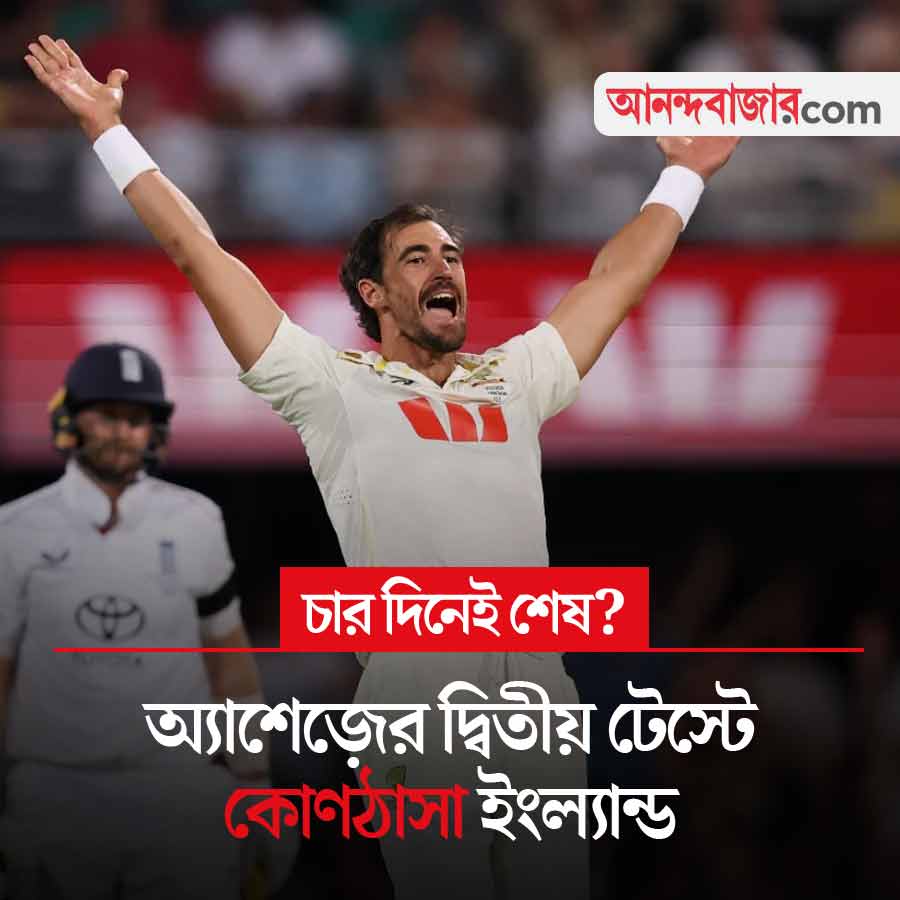 দ্বিতীয় টেস্টেও কোণঠাসা ইংল্যান্ড। অ্যাশেজ়ে অস্ট্রেলিয়ার বিরুদ্ধে তারা এখনও ৪৩ রানে পিছিয়ে, হাতে ৪ উইকেট। ইংল্যান্ডের ৩৩৪ রানের জবাবে অস্ট্রেলিয়ার প্রথম ইনিংস শেষ হয় ৫১১ রানে। দ্বিতীয় ইনিংসে ইংল্যান্ড ১৩৪ রান তুলতেই ৬ উইকেট হারিয়েছে। মিচেল স্টার্ক, মাইকেল নাসের ও স্কট বোল্যান্ড ২টি করে উইকেট নিয়েছেন। প্রথম টেস্ট শেষ হয়েছিল দু’দিনে। দ্বিতীয় টেস্ট আজই কি শেষ হয়ে যাবে? আজ চতুর্থ দিনের খেলা সকাল ৯:৩০ থেকে। খেলা দেখা যাবে স্টার স্পোর্টস চ্যানেল ও জিয়োহটস্টার অ্যাপে।