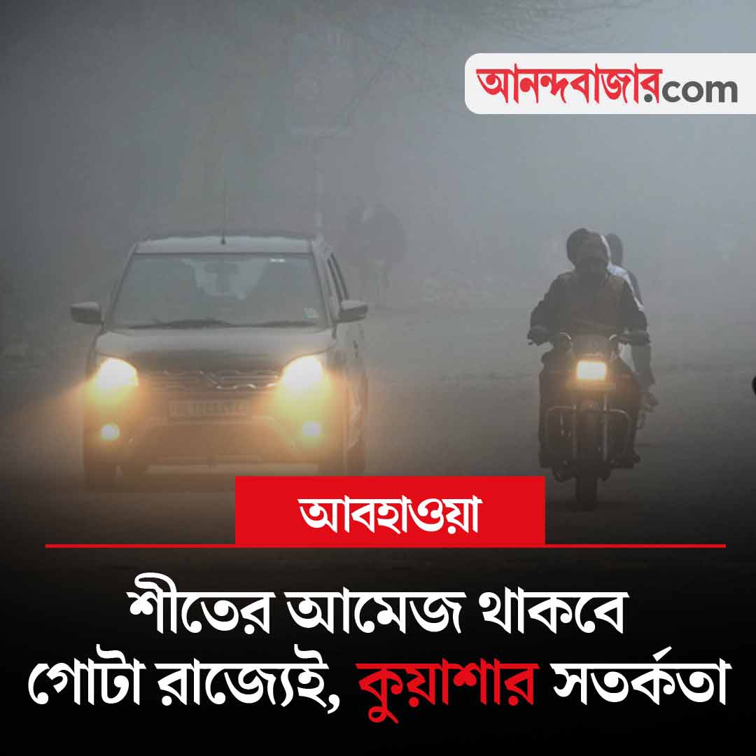 উত্তর ও দক্ষিণবঙ্গের জেলাগুলিতে আগামী সাত দিনে নতুন করে তাপমাত্রায় খুব বড় কোনও পরিবর্তন হবে না। রাতের তাপমাত্রা মোটের উপর একই রকম থাকবে। সামান্য হেরফের হতে পারে দিনের তাপমাত্রায়। সর্বত্র শীতের আমেজ বজায় থাকবে। আলিপুর আবহাওয়া দফতর জানিয়েছে, রাজ্যের সর্বত্র আাপাতত শুকনো আবহাওয়া থাকবে। কোথাও বৃষ্টির সম্ভাবনা নেই। তবে বেশ কয়েকটি জেলায় কুয়াশার সতর্কতা জারি করা হয়েছে। উত্তরবঙ্গের দার্জিলিং, জলপাইগুড়ি, কালিম্পং, আলিপুরদুয়ার, উত্তর দিনাজপুর, দক্ষিণ দিনাজপুর এবং মালদহে আজ সকালে কুয়াশা থাকবে।