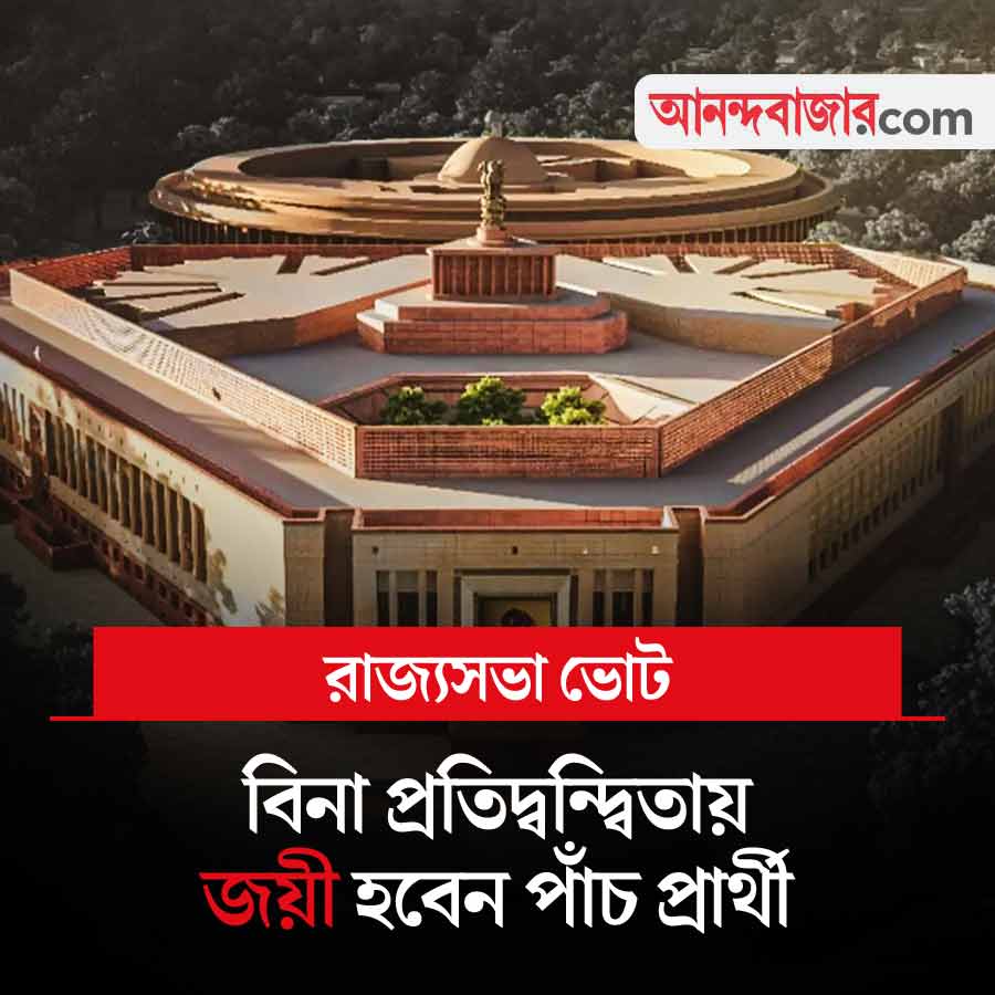 পশ্চিমবঙ্গে রাজ্যসভার নির্বাচন যে হবে না তা বৃহস্পতিবার মনোনয়ন দাখিলের দিনেই বোঝা গিয়েছিল। কারণ, পাঁচ আসনে পাঁচ জন প্রার্থী মনোনয়ন জমা দিয়েছিলেন। সোমবার মনোনয়ন প্রত্যাহারের শেষ দিন। সোমবার দুপুর তিনটেয় মনোয়নয়ন প্রত্যাহারের সময়সীমা শেষ হলেই পাঁচ জন প্রার্থীকে বিজয়ী ঘোষণা করে জয়ীর শংসাপত্র দেওয়া হবে। তৃণমূলের পক্ষে প্রাক্তন পুলিশকর্তা রাজীব কুমার, অভিনেত্রী কোয়েল মল্লিক, মন্ত্রী তথা গায়ক বাবুল সুপ্রিয় এবং আইনজীবী মেনকা গুরুস্বামী বিনা প্রতিদ্বন্দ্বিতায় রাজ্যসভায় যেতে চলেছেন। অন্য দিকে, বিজেপির মনোনীত রাহুল সিংহ‌ও যাচ্ছেন রাজ্যসভায়।