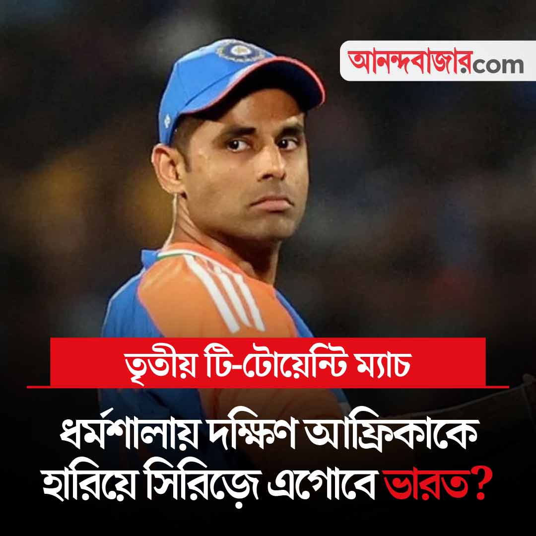 কটকে ভারত জিতলেও মুল্লানপুরে জিতে টি-টোয়েন্টি সিরিজ়ে সমতা ফিরিয়েছে দক্ষিণ আফ্রিকা। আজ ধর্মশালায় তৃতীয় ম্যাচ। যে জিতবে তার কাছেই সিরিজ়ে এগিয়ে যাওয়ার সুযোগ। সূর্যকুমার যাদবেরা কি পারবেন জিততে? সন্ধ্যা ৭টা থেকে শুরু ম্যাচ। দেখা যাবে স্টার স্পোর্টসের বিভিন্ন চ্যানেল এবং জিয়োহটস্টার অ্যাপে।