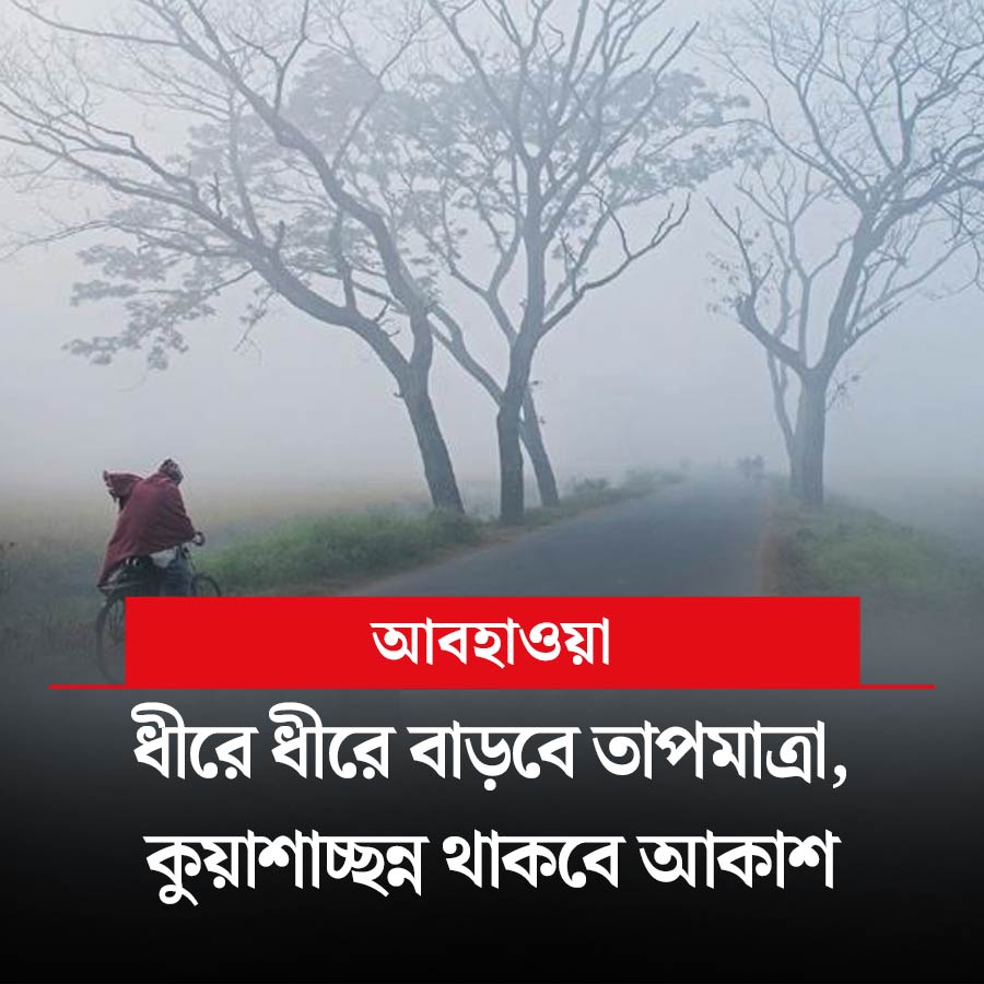 আগামী চার দিন রাজ্যের উত্তর থেকে দক্ষিণে তাপমাত্রা বাড়তে পারে ২ থেকে ৩ ডিগ্রি সেলসিয়াস। তার পরের তিন দিন তাপমাত্রার কোনও হেরফের হবে না। মঙ্গলবার থেকে বৃহস্পতিবার পর্যন্ত ভোরবেলা কুয়াশাচ্ছন্ন থাকবে আকাশ। দৃশ্যমানতা নামতে পারে ২০০ মিটারে।