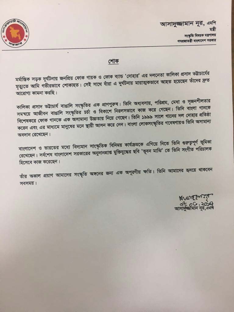 ‘ভুবনমাঝি’র পরিচালক ফাখরুল আরেফিন তাঁর প্রয়াণ সংবাদ পেয়ে বললেন, ‘‘সোমবার রাতেও ফেসবুক মেসেঞ্জারে জানতে চেয়েছেন, ছবি কেমন চলছে? ছবির কোনও শিল্পীর সম্মান দক্ষিণা বাকি নেই। কেবল কালিকাদাকে জোর করেও দিতে পারলাম না। সঙ্গীত তৈরির সময় প্রায় ১৬দিন তাঁর সঙ্গে কাটিয়েছিলাম। খবরটা সব এলোমেলো করে দিল।’’