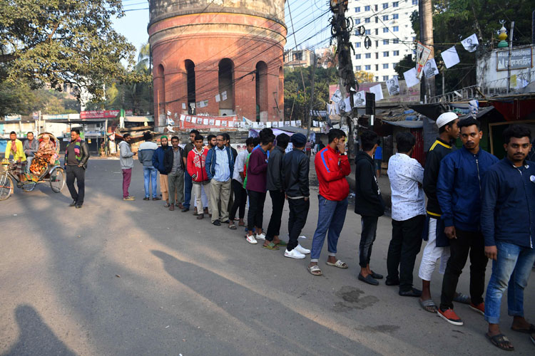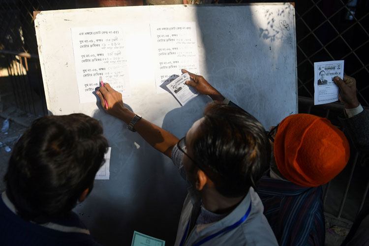 ঢাকায় একটি বুথের বাইরে ভোটারদের তালিকা দেখার ভিড়। ছবি: এএফপি।