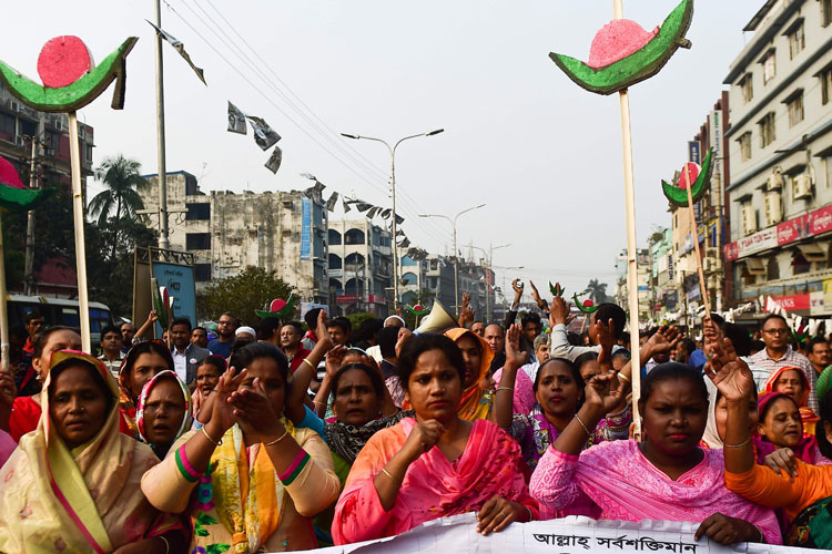 জয়ের পর আওয়ামি লিগের মহিলা সমর্থকদের বিজয় মিছিল। ছবি: পিটিআই।