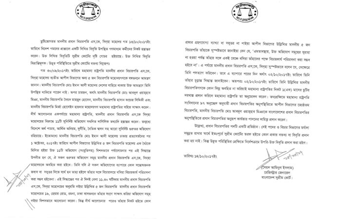 বিবৃতিতে অনুযায়ী, “তার কাছ থেকে কোনও গ্রহণযোগ্য ব্যাখ্যা ও সুদত্তর না পেয়ে আপিল বিভাগের পাঁচ বিচারপতি তাকে সুস্পষ্টভাবে জানিয়ে দেন যে, এই অবস্থায় অভিযোগসমূহের সুরাহা না হওয়া পর্যন্ত তার সঙ্গে একই বেঞ্চে বসে তাদের পক্ষে বিচারকাজ পরিচালনা সম্ভবপর হবে না। এই পর্যায়ে মাননীয় প্রধান বিচারপতি এস কে সিনহা সুস্পষ্টভাবে বলেন যে সেক্ষেত্রে তিনি পদত্যাগ করবেন। তবে ২/১০/২০১৭ তারিখে তিনি চূড়ান্ত সিদ্ধান্ত জানাবেন বলে জানান।”