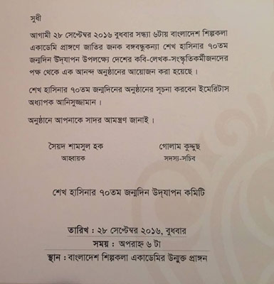 শেখ হাসিনার জন্মদিন পালন কমিটির আহ্বায়ক ছিলেন কবি সৈয়দ শামসুল হক। এটি সেই কমিটির কার্ড।নিজস্ব চিত্র।