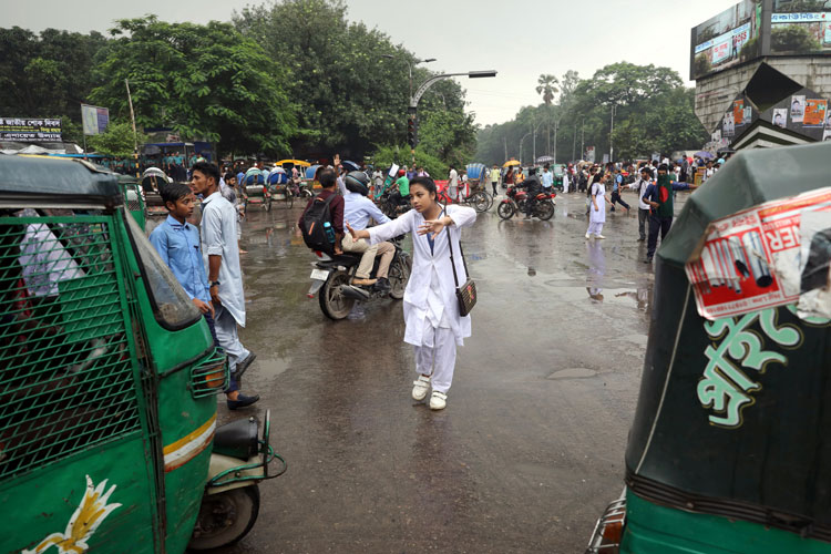 ঢাকার রাস্তায় ট্রাফিক নিয়ন্ত্রণে পড়ুয়ারা। ছবি: এএফপি।