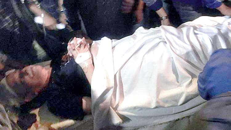 রক্তাক্ত: আহত লেখক জাফর ইকবালকে হাসপাতালে নিয়ে যাওয়া হচ্ছে। শনিবার সিলেটে। —নিজস্ব চিত্র।