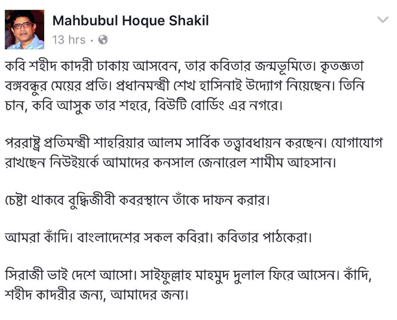 মাহবুবুল হক শাকিল আরও লেখেন, ‘‘চেষ্টা থাকবে বুদ্ধিজীবী কবরস্থানে তাঁকে দাফন করার। আমরা কাঁদি। বাংলাদেশের সকল কবিরা। কবিতার পাঠকেরা। সিরাজী ভাই দেশে আসো। সাইফুল্লাহ মাহমুদ দুলাল ফিরে আসেন। কাঁদি, শহীদ কাদরীর জন্য, আমাদের জন্য।’’