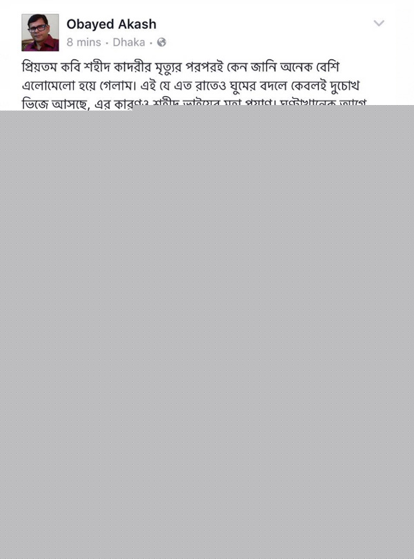 কাদরীর প্রতি ফেসবুকে শ্রদ্ধা জানালেন কবি ওবায়েদ আকাশ