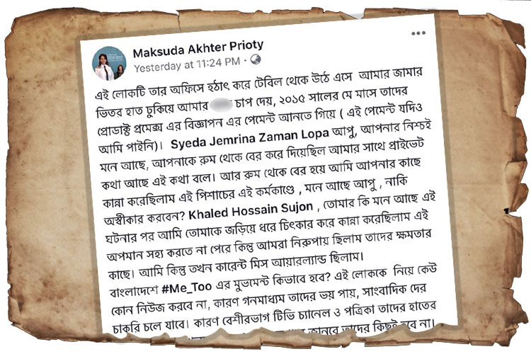 মিটু ঝড় এ বার বাংলাদেশে। মুখ খুললেন প্রাক্তন মিস আয়ারল্যান্ড মাকসুদা আখতার প্রিয়তি। অভিযোগ করলেন, যৌন নির্যাতনের শিকার হয়েছিলেন তিনি।