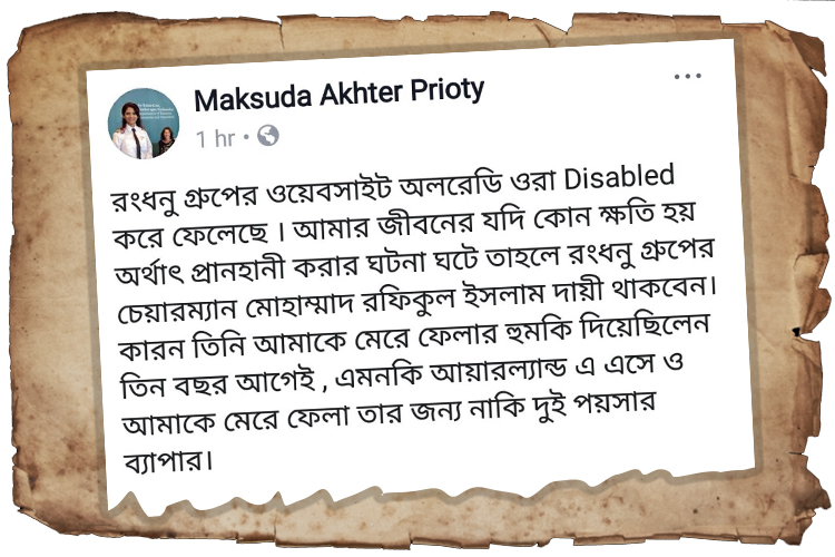 তাঁর দাবি,‘‘রফিকুল ইসলাম নামে ওই ব্যবসায়ী ফোনে হুমকি দিয়ে বলেছিলেন, আয়ারল্যান্ড বেশি দূরে নয়, আমার জন্য দু’সেকেন্ডের ব্যাপার।” প্রিয়তি তাঁর পোস্টে সে কথা লিখেওছেন, ‘আমার জীবনের যদি কোনও ক্ষতি হয় অর্থাৎ প্রাণহানী করার ঘটনা ঘটে, তাহলে মহম্মদ রফিকুল ইসলাম দায়ী থাকবেন। কারণ তিনি আমাকে মেরে ফেলার হুমকি দিয়েছিলেন তিন বছর আগেই, এমনকি আয়ারল্যান্ডে এসেও আমাকে মেরে ফেলা তার জন্য নাকি দুই পয়সার ব্যাপার।’