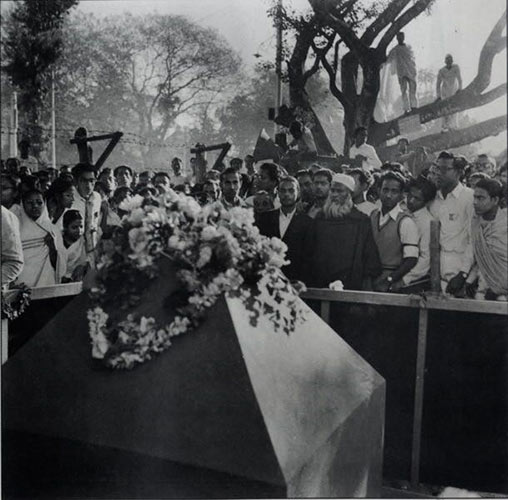 ২১ ফেব্রুয়ারি, ১৯৫৬। পুলিশের গুলিতে নিহতদের স্মরণে ‘শহিদ মিনার’-এর ভিত্তিপ্রস্তর স্থাপন অনুষ্ঠানে মৌলানা আব্দুল খান ভাসানি।