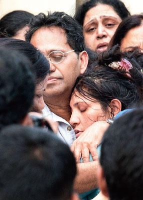 সন্তানহারার কান্না। তারিশি জৈনের শেষকৃত্যে তাঁর বাবা-মা। সোমবার গুড়গাঁওয়ে। ছবি: এপি