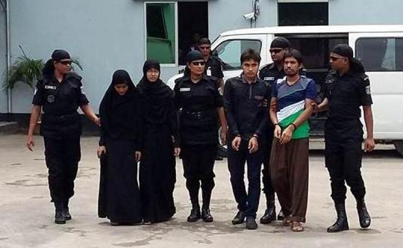 ধৃত দম্পতিদের মধ্যে বাঁ দিক থেকে নাহিদা, সুমি, শরিফুল, আমিনুল