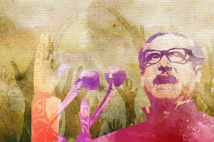 ৭ মার্চের সেই দুনিয়া-কাঁপানো ভাষণে তাঁর জনগোষ্ঠীর ন্যায্য দাবিদাওয়ার কথা বজ্রকণ্ঠে তুলে ধরেছিলেন বঙ্গবন্ধু শেখ মুজিবুর রহমান। অলঙ্করণ: তিয়াসা দাস।