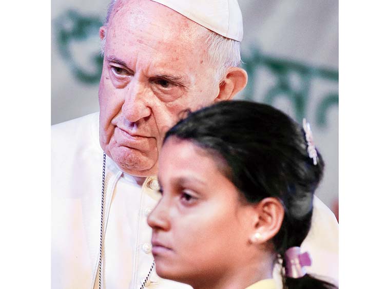 পাশে: রোহিঙ্গা কিশোরীর সঙ্গে পোপ। শুক্রবার ঢাকায়।