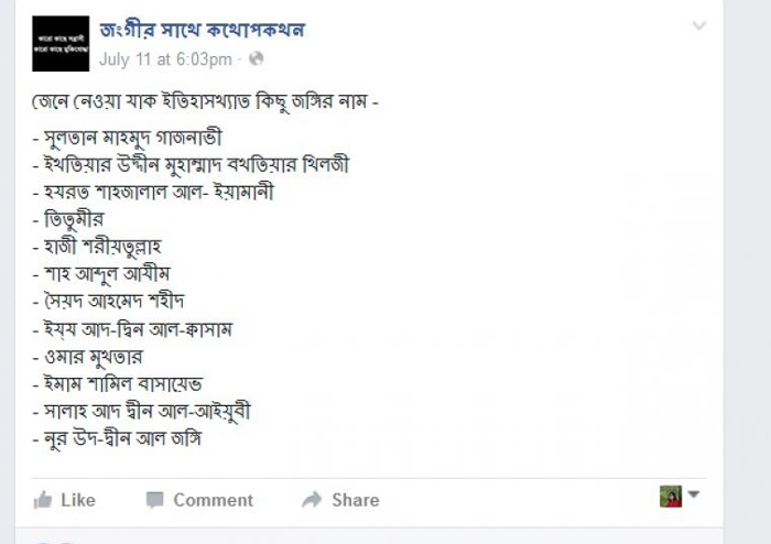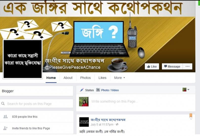 সন্ত্রাসবাদের হয়ে প্রচার চালাতে বাংলাদেশে এই রকম অনেকগুলি ফেসবুক পেজ এখন সক্রিয়। এই সব পেজ এখনও নিয়মিত আপডেট হচ্ছে। রোজ কট্টরবাদের সপক্ষে নতুন নতুন পোস্ট হচ্ছে, জঙ্গিদের সমর্থনে খোলাখুলি আলোচনাও চলছে। বিভিন্ন ঐতিহাসিক চরিত্রকে ‘জঙ্গি’ হিসেবে পরিচয় দিয়ে সন্ত্রাসবাদের গৌরব বৃদ্ধির চেষ্টা চালাচ্ছে এই সব ফেসবুক পেজ। ‘জঙ্গির সাথে কথোপকথন’ নামের পেজটিতে ইতিহাস প্রসিদ্ধ জঙ্গিদের যে তালিকা প্রকাশ করা হয়েছে, তা এক বার দেখে নিন:
