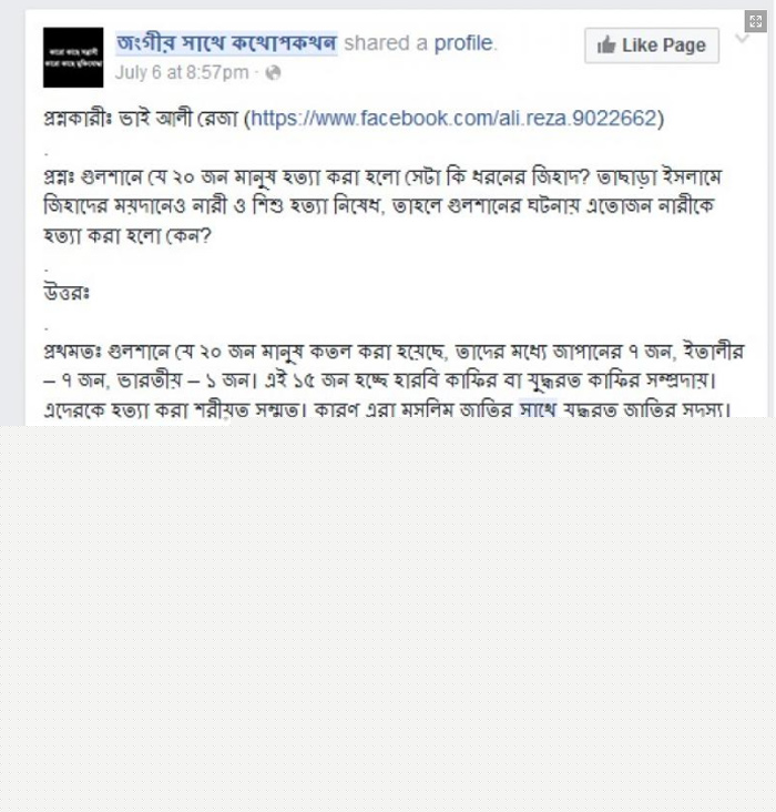‘জঙ্গির সাথে কথোপকথন’ নামের ফেসবুক পেজটিতে আবার ঢাকার গুলশনে বিদেশিদের হত্যা করার পক্ষে যুক্তিও দেওয়া হয়েছে। গুলশনের জঘন্য হামলা নিয়ে এক ব্যক্তি প্রশ্ন তুলেছিলেন ওই ফেসবুক পেজে। তাঁর সঙ্গে ফেসবুক পেজটির নিয়ন্ত্রকের (অ্যাডমিন) কী ধরনের কথোপকথন হয়েছে দেখে নিন: