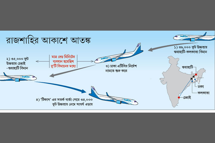 পরিস্থিতি দেখে কলকাতার এটিসি থেকে ওই বিমানের পাইলটকে সতর্ক করা হয়— একই উচ্চতায় আরও একটি বিমান এগিয়ে যাচ্ছে। যে হেতু বাংলাদেশের আকাশপথে ঘটনাটি ঘটছে, তাই কলকাতা থেকে কোনও নির্দেশ দেওয়া সম্ভব হয়নি। শুধুমাত্র সতর্ক করা হয়। কিন্তু, ওই পাইলটও ঢাকা এটিসিকে বিষয়টি জানাননি। ফলে একই উচ্চতায় ক্রমশই কাছাকাছি হতে থাকে ইন্ডিগোর বিমান দু’টি।