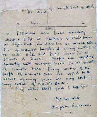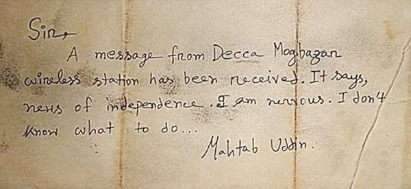 ২৫ মার্চ ১৯৭১ রাতে বঙ্গবন্ধুর হাতে লেখা বার্তা এসেছিল ঢাকার মগবাজার টিএন্ডটি অফিসের মাহতাব উদ্দীন এর কাছে। মাহতাব উদ্দিন ২৬ মার্চ ভোর ৬টায় ওয়্যারলেস যোগে চট্টগ্রাম সহ দেশের কয়েকটি টেলিগ্রাফ স্টেশনে পাঠান। যা রিসিভ করেন চট্টগ্রাম অফিসের ইঞ্জিনিয়র আব্দুল কাদের। তার পর এই ম্যাসেজটি লিফলেট আকারে চট্টগ্রামে প্রচার করা হয়। এই লিফলেটই তখনকার চট্টগ্রাম আওয়ামিলিগ-এর নেতা এম এ হান্নানের কাছেও পৌঁছয় এবং তিনি ২৬ মার্চ ১৯৭১ সন্ধ্যায় চট্টগ্রাম রেডিও থেকে বঙ্গবন্ধুর এই ঘোষণাটি প্রথম পাঠ করেন। সেই মাহতাব উদ্দীন এবং ইঞ্জিনিয়র আব্দুল কাদের এখনও বেঁচে আছেন।
