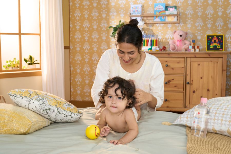 প্রথমে, শিশুর মাথার উপরে অল্প ‘জনসনস্ বেবি অয়েল’ দিয়ে আলতো চাপ দিতে পারেন। তবে আপনার শিশুর মাথার নরম স্থানের দিকে বিশেষ নজর ও যত্ন দেবেন এবং এই অংশে চাপ প্রয়োগ করবেন না।