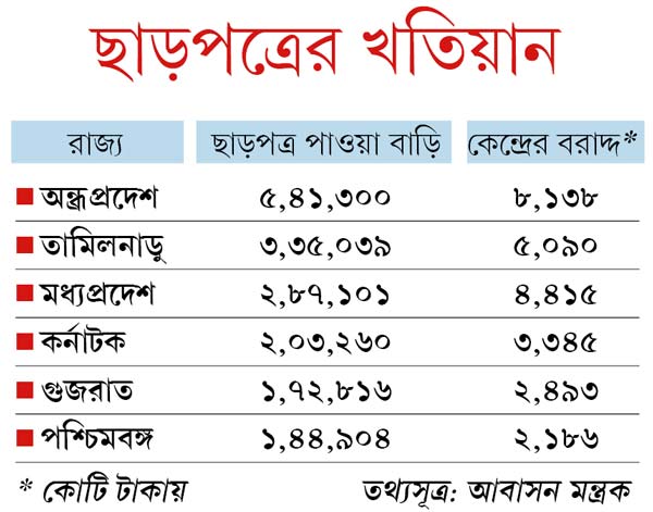 কেন্দ্রের হিসেব বলছে, প্রধানমন্ত্রী আবাস যোজনায় ছাড়পত্র পাওয়া মোট বাড়ির ৮২ শতাংশই প্রথম দশটি রাজ্যের দখলে। ৫ লক্ষের বেশি বাড়ির ছাড়পত্র পেয়ে শীর্ষে অন্ধ্রপ্রদেশ। সেখানে সুদে ভর্তুকি বাবদ কেন্দ্রের বরাদ্দ ৮,০০০ কোটি টাকারও বেশি। পশ্চিমবঙ্গে ছাড়পত্র পেয়েছে প্রায় ১.৪৫ লক্ষ বাড়ি। কেন্দ্রের আর্থিক সহায়তা দু’হাজার কোটির বেশি।