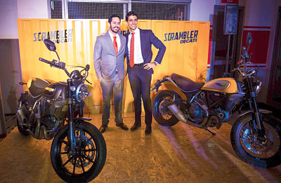 এনেছে দু’টি স্ক্র্যাম্বলার বাইকও। উদ্বোধনে সংস্থা-কর্তা রবি আভালুর এবং পিয়ের-ফ্রান্সেস্কো স্ক্যালজো (বাঁ দিক থেকে)।