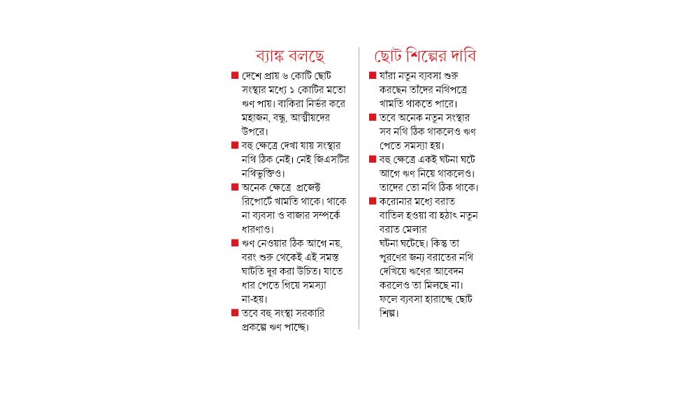 সম্প্রতি এইচডিএফসি ব্যাঙ্কের সিনিয়র এগ্জ়িকিউটিভ ভাইস প্রেসিডেন্ট সুমন্ত রামপাল বলেন, দেশে ছোট সংস্থার ছ’ভাগের এক ভাগ ব্যাঙ্ক ঋণ পায়। বাকিদের কারও নথি অমিল, তো কারও জিএসটিতে নথিভুক্তি নেই। কারও প্রজেক্ট রিপোর্ট সম্পূর্ণ নয়। ফলে আগে এদের ঋণ পাওয়ার উপযুক্ত করে তুলতে হবে। স্টেট ব্যাঙ্কের বেঙ্গল সার্কেলের কর্তা রঞ্জন কুমার মিশ্রের কথায়, ‘‘দেখা গিয়েছে, অনেক ক্ষেত্রেই সংশ্লিষ্ট ব্যবসা বা তার বাজার সম্পর্কে যথেষ্ট ধারণা নেই তাঁর।’’ একই মত জানিয়ে বন্ধন ব্যাঙ্কের প্রতিষ্ঠাতা এবং এমডি-সিইও চন্দ্রশেখর ঘোষও বলেন, ‘‘অনেক সময়ে ঋণ নেওয়ার আগে শেষ মুহূর্তে নথিপত্রের ঘাটতি পূরণ করার চেষ্টা করে ছোট সংস্থাগুলি। কিন্তু তখন সেটা সম্ভব হয় না। ফলে চাইলেও ব্যাঙ্কগুলি ওই সব সংস্থাকে ঋণ দিতে পারে না। তাই আগে থেকে তৈরি হওয়া জরুরি।’’