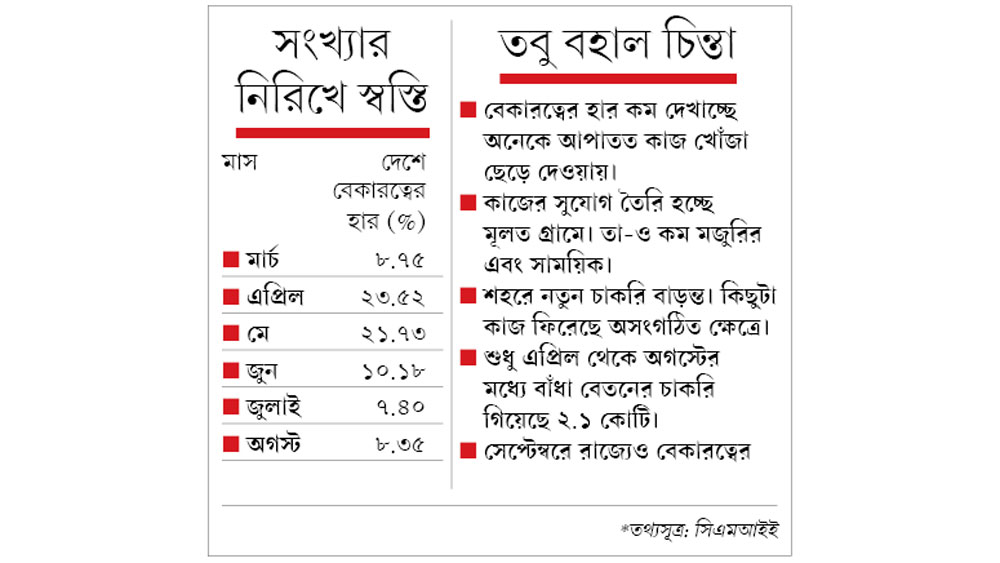 কিন্তু অর্থনীতিতে কাজ যেখানে এমনিই বাড়ন্ত, সেখানে নিজেদের কাজের বাজার থেকে সরানোর কারণ? তথ্য বলছে, কাজের সুযোগ মূলত তৈরি হয়েছে গ্রামে। একশো দিনের কাজে বরাদ্দ বেড়েছে। পরিযায়ী শ্রমিকদের কথা মাথায় রেখে চালু হওয়া সরকারি প্রকল্পেও রোজগারের জন্য নাম লিখিয়েছেন অনেকে। ওই সব কাজের মজুরি এবং স্থায়িত্ব দুই-ই কম। কিন্তু আপাতত সংসার চালাতে অনেকে তাতে নাম লেখানোয়, প্রকৃত অর্থেই কর্মহীনের সংখ্যা কমেছে। সেপ্টেম্বরে গ্রামাঞ্চলে যেখানে ৭৪ লক্ষ জন কাজে যোগ দিয়েছেন, সেখানে ঘোষিত বেকারের সংখ্যা কমেছে ৫০ লক্ষ। অর্থাৎ, কাজে যোগ দিয়েও তা মনঃপুত না-হওয়ায় অনেকে নতুন জীবিকার সন্ধানে রয়েছেন।