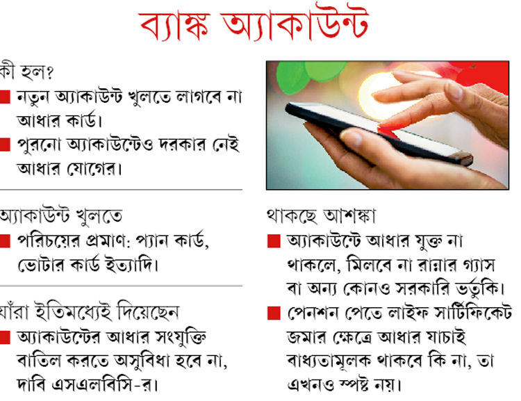 তবে স্টেট লেভেল ব্যাঙ্কার্স কমিটির (এসএলবিসি) দাবি, আধার ছাড়া ব্যাঙ্কে অ্যাকাউন্ট খোলা যাবে ঠিকই। কিন্তু অ্যাকাউন্টের সঙ্গে আধার নম্বর যুক্ত না থাকলে সেখানে রান্নার গ্যাস বা অন্য কোনও সরকারি ভর্তুকির টাকা জমা পড়বে না।