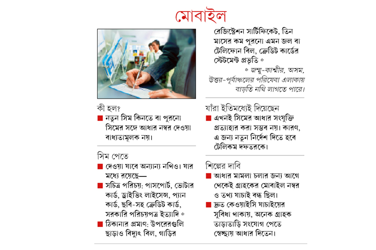 এ দিকে, গ্রাহকদের দাবি মোবাইলের সিম কিনতেও এখন আধার লাগে। বিশেষত রিলায়্যান্স জিয়োর। সে ক্ষেত্রে এ বার তাদের সিম মিলবে কী ভাবে? এ দিন রাত পর্যন্ত জিয়োর জবাব মেলেনি। যদিও ভোডাফোন-আইডিয়া ও এয়ারটেল সূত্রের দাবি, তারা টেলিকম দফতর (ডট) স্বীকৃত অন্যান্য নথির ভিত্তিতেও সিম দেয়। টেলি শিল্পের সংগঠন সিওএআইয়ের ডিজি রাজন এস ম্যাথুজও বলছেন, সেই ব্যবস্থা আগে থেকেই রয়েছে। তবে ডটের নতুন নির্দেশ এলে তা মেনে চলা হবে।