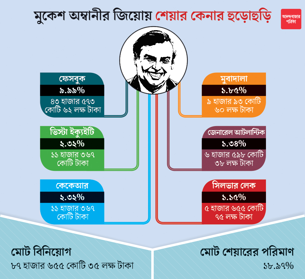 এ দিন রিলায়্যান্সের তরফে জানানো হয়েছে, ৯ হাজার ৯৩ কোটি ৬০ লক্ষ টাকায় মুকেশের জিয়ো প্ল্যাটফর্মের ১.৮৫ শতাংশ শেয়ার কিনছে আবু ধাবির রাষ্ট্র-পরিচালিত সংস্থা মুবাদালা। কোনও ভারতীয় সংস্থায় এর আগে এই পরিমাণে লগ্নি করেনি মুবাদালা।
