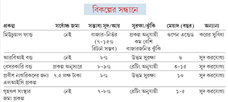 মিউচুয়াল ফান্ড ছাড়া বিকল্প হিসেবে বেছে নেওয়া যেতে পারে সরকারি এবং বেসরকারি বন্ড ও ডিবেঞ্চার, গৃহঋণ সংস্থার জমা প্রকল্প, ভারত সরকারের বন্ড (আরবিআই বন্ড) এবং জীবনবিমা নিগমের মাধ্যমে বাজারে ছাড়া প্রবীণ নাগরিকদের জন্য নতুন প্রকল্প। সবক’টিতেই সুদ বর্তমান ব্যাঙ্ক আমানতের উপর পাওয়া হারের তুলনায় বেশি। আসুন এক এক করে দেখে নিই প্রকল্পগুলির ভাল-মন্দ।